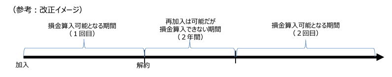 ○特定の基金に対する負担金等の損金算入の特例における独立行政法人中小企業基盤整備機構が行う中小企業倒産防止共済事業に係る措置について、中小企業倒産防止共済法の共済契約の解除があった後同法の共済契約を締結した場合には、その解除の日から同日以後2年を経過する日までの間に支出する当該共済契約に係る掛金については、本特例の適用ができないこととする(所得税についても同様とする。)。